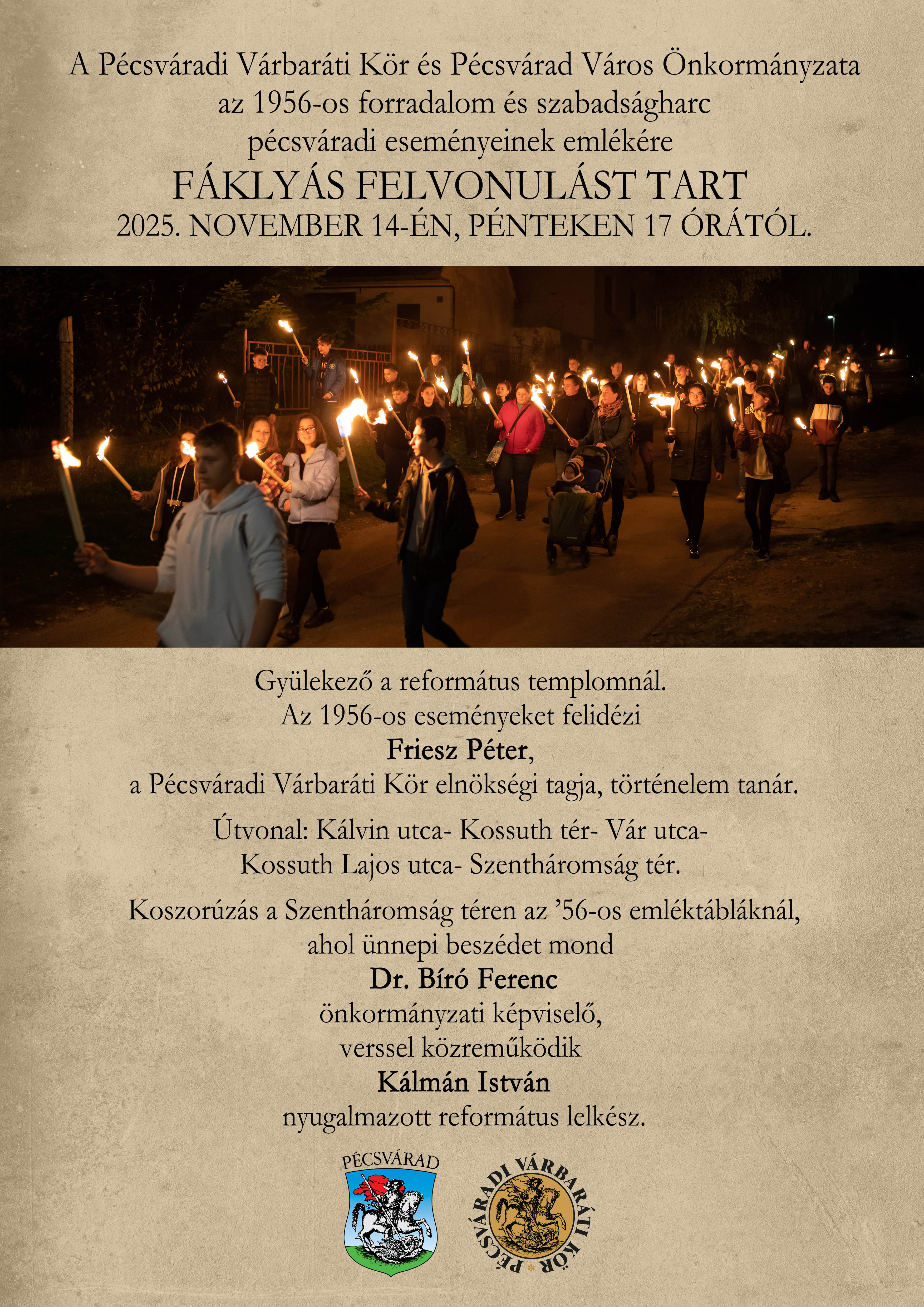 Indulás hagyományosan a református templomtól 17 órakor, rövid megálló az '56-os emlékműnél, majd vonulunk tovább a Szentháromság téri emléktábláig.